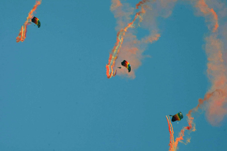 11月3日,空軍八一飛行表演隊和空軍八一跳傘隊在北京沙河機場舉行預(yù)演,迎接中國人民解放軍空軍建軍六十周年。