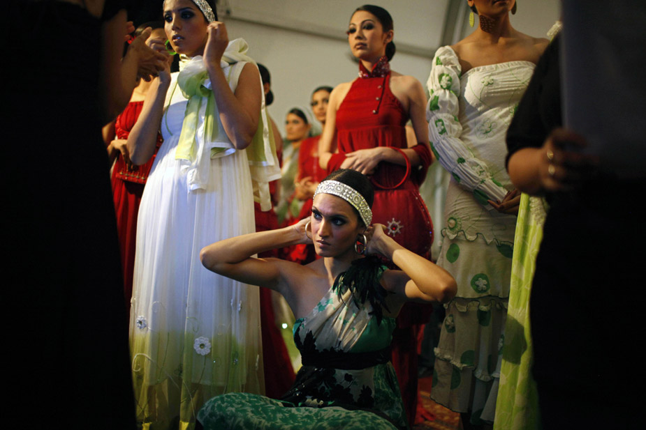 11月5日,巴基斯坦第一屆時(shí)裝周在卡拉奇拉開(kāi)帷幕。美女模特們身著裸露雙肩和肚臍的非伊斯蘭傳統(tǒng)服裝在T臺(tái)上走秀。