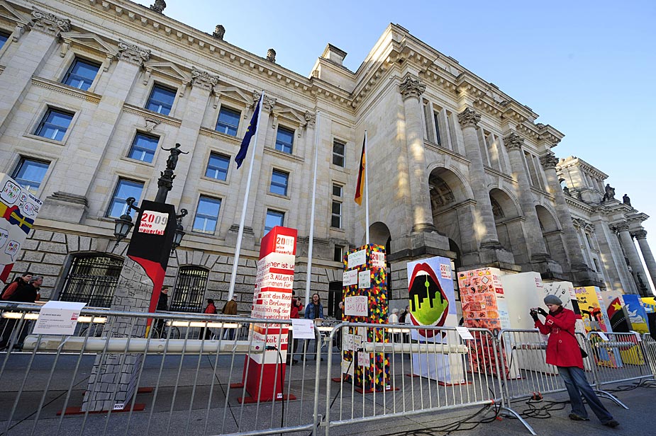 周五(6日),為了紀念柏林墻倒塌20周年,德國柏林的勃蘭登堡門附近擺放了一排墻體模型。來源:中國新聞網(wǎng)