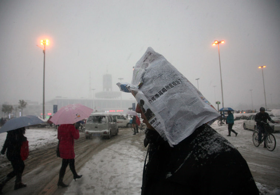 圖為一位行人將報(bào)紙折成帽子擋雪。 阿拉爾 攝