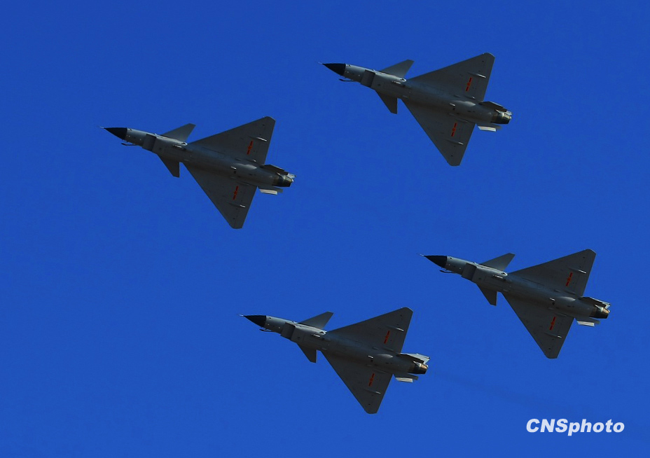慶祝中國人民解放軍空軍成立60周年飛行表演,11月15日上午在北京沙河機(jī)場舉行。表演按八一飛行表演隊(duì)4架殲-10飛機(jī)表演12個動作和6架殲-7GB飛機(jī)表演15個動作,分四機(jī)對頭交叉、四機(jī)菱形隊(duì)大坡度盤旋、單機(jī)小速度平飛等27個動作,其中四機(jī)對頭交叉動作是這次表演中技術(shù)難度較大的動作之一,這是國產(chǎn)三代飛機(jī)和國產(chǎn)二代飛機(jī)首次同場競技表演。圖為八一飛行隊(duì)殲-10進(jìn)行表演。中新社發(fā) 宋吉河 攝