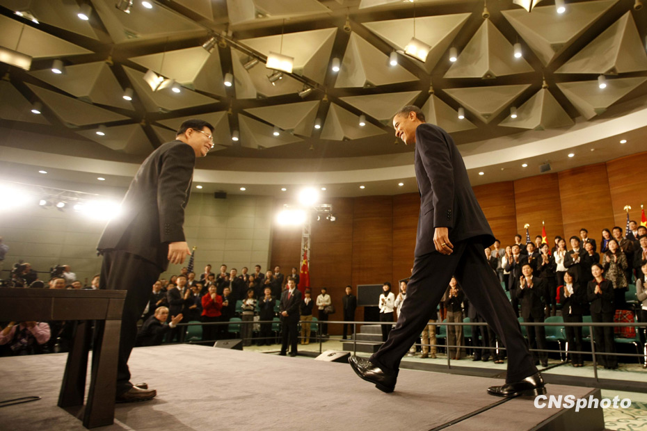 11月16日,正在上海訪問的美國總統(tǒng)奧巴馬現(xiàn)身位于浦東的上海科技館,與四百余中國青年進(jìn)行面對面交流。 圖片來源:中國新聞網(wǎng)