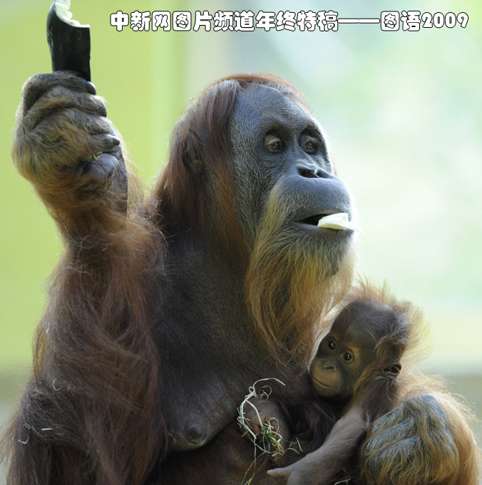 德國慕尼黑的一家動物園里,一只紅毛猩猩懷抱著它四個月大的“寶寶”。