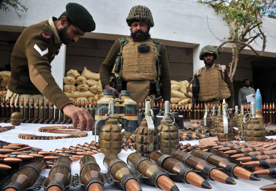 12月12日,在巴基斯坦西北部開伯爾部落地區(qū),巴基斯坦軍方抓獲多名塔利班武裝分子,繳獲大量軍火。圖片來源:中國新聞網(wǎng)