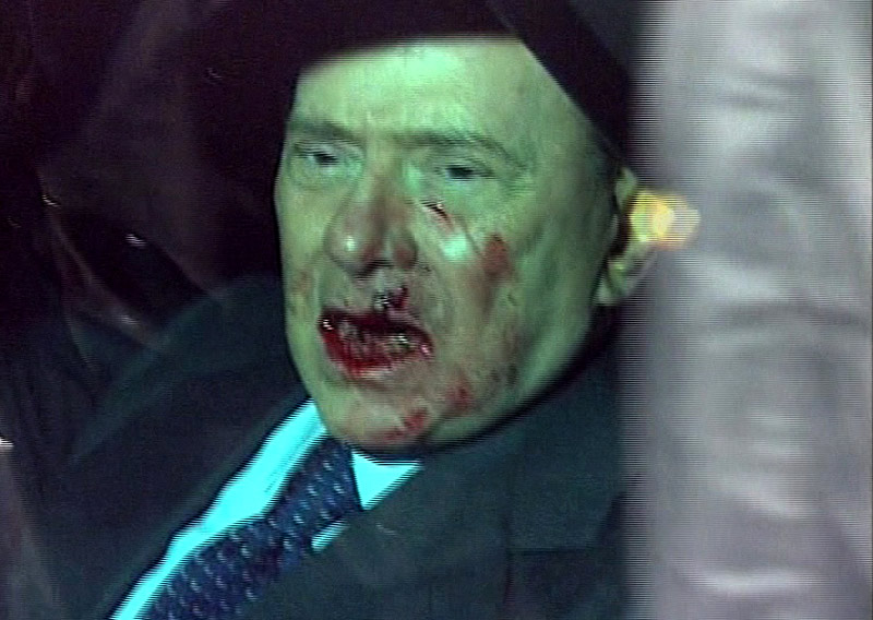 意大利總理貝盧斯科尼13日晚間受邀在米蘭參加一個(gè)集會(huì)時(shí)遭到襲擊,面部受傷流血,隨后被緊急送醫(yī)治療。圖片來源:中國(guó)新聞網(wǎng)