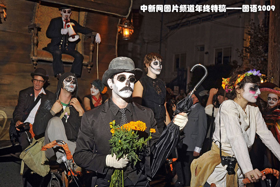 美國舊金山居民歡慶“亡靈節(jié)”——11月2日,美國舊金山居民扮成鬼怪模樣慶!巴鲮`節(jié)”!巴鲮`節(jié)”是拉美地區(qū)的傳統(tǒng)節(jié)日,類似于中國的清明節(jié)。