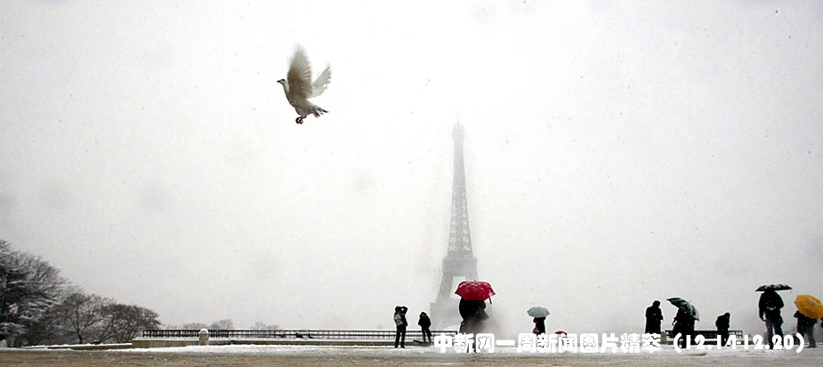 17日(周四),巴黎降下大雪,一只白鴿冒雪飛起,不遠(yuǎn)處的埃菲爾鐵塔在雪中若隱若現(xiàn)。圖片來源:中國(guó)新聞網(wǎng)