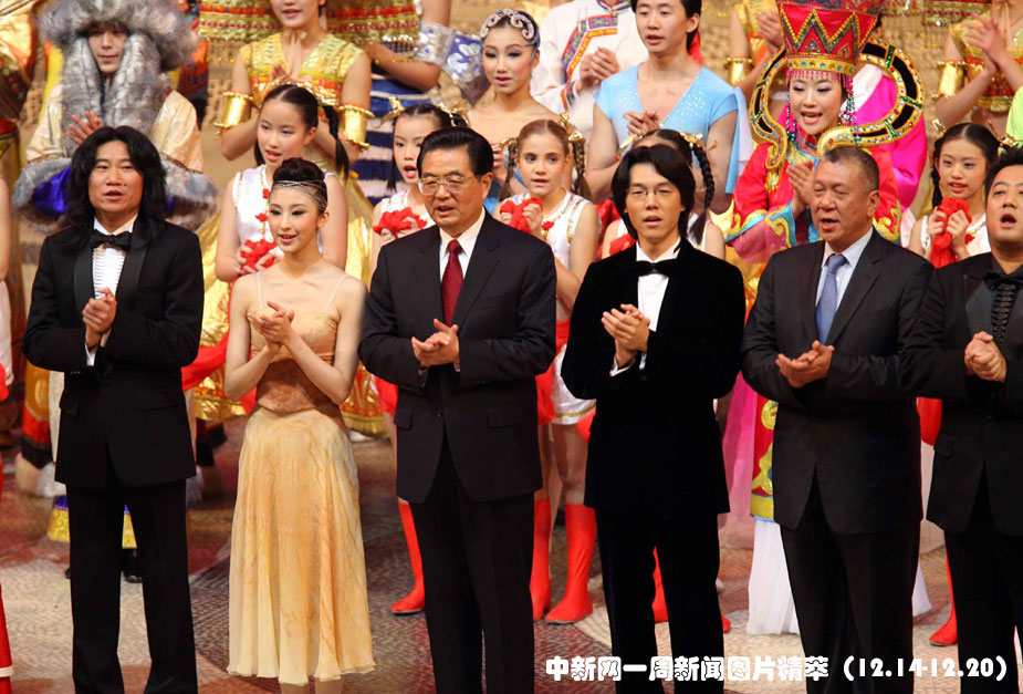 19日(周六)晚間,澳門特區(qū)舉行盛大文藝晚會,慶祝澳門回歸祖國十周年。國家主席胡錦濤與演員一起唱響《歌唱祖國》。圖片來源:中國新聞網(wǎng)