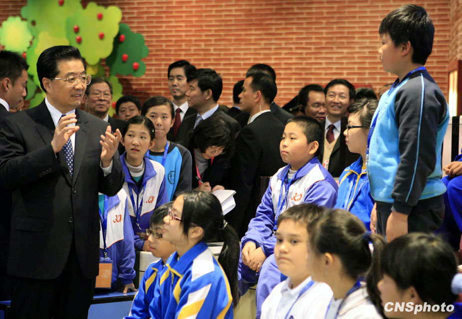 12月19日下午,國家主席胡錦濤在澳門特首何厚鏵陪同下參觀澳門科學(xué)館,并與當(dāng)?shù)貙W(xué)生親切交流。中新社發(fā) 張勤 攝