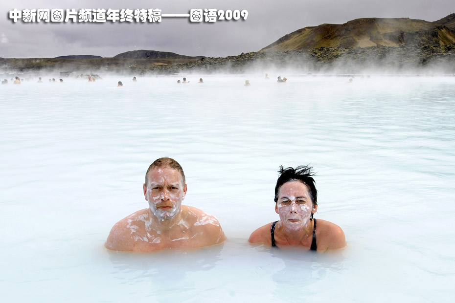 4月26日,兩名游客在冰島雷克雅維克藍礁湖泡天然熔巖流溫泉。