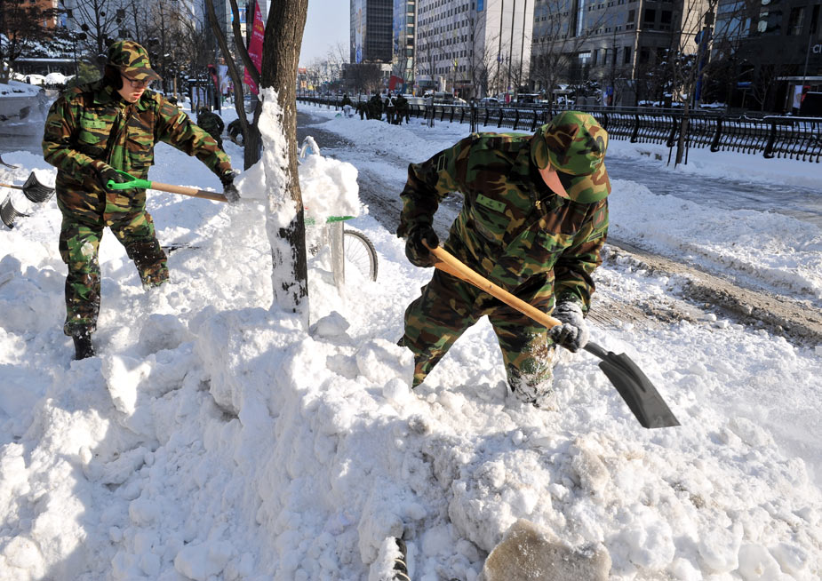 四日,韓國(guó)大部分地區(qū)遭遇大雪。至下午二時(shí)左右,首爾地區(qū)積雪厚度超過(guò)二十八厘米,這是韓國(guó)自一九三七年開(kāi)始進(jìn)行積雪量觀測(cè)以來(lái)的最新紀(jì)錄。圖為1月5日,韓國(guó)士兵在街頭除雪。