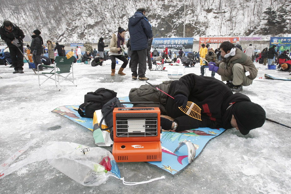 2010年1月9日,韓國華川郡,一年一度的華川山鱒魚節(jié)當日舉行。數(shù)千游客在此“破冰”比賽釣鱘魚。該活動每年都會吸引上百萬游客前來。
