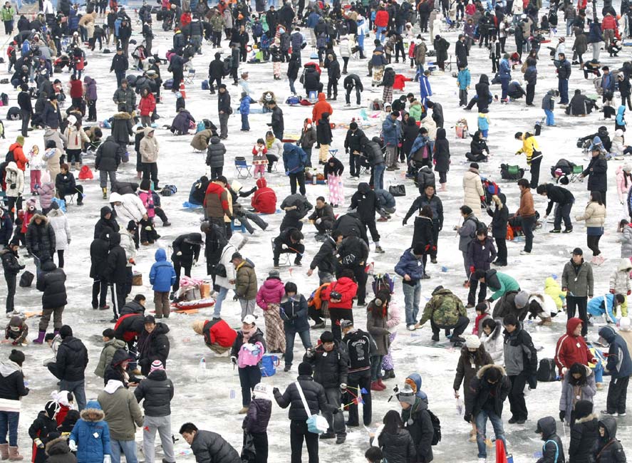 2010年1月9日,韓國華川郡,一年一度的華川山鱒魚節(jié)當日舉行。數(shù)千游客在此“破冰”比賽釣鱘魚。該活動每年都會吸引上百萬游客前來。