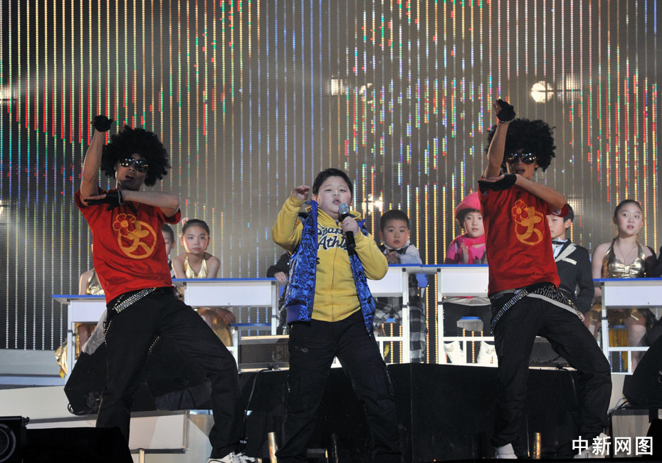 1月11日晚,第二屆音樂風(fēng)云榜新人盛典在京舉行,盛典現(xiàn)場的音樂課上,兒童版的Wonder Girl、Super Junior、邁克爾·杰克遜、曾軼可、大張偉紛紛登臺獻(xiàn)藝,讓現(xiàn)場觀眾們笑聲不斷。中新網(wǎng)記者 金碩 攝