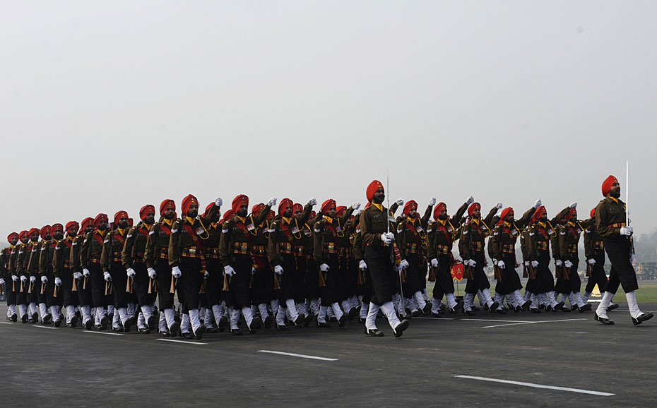 1月15日,在印度首都新德里舉行的建軍節(jié)閱兵式上,印度士兵接受檢閱。圖片來源:中國新聞網