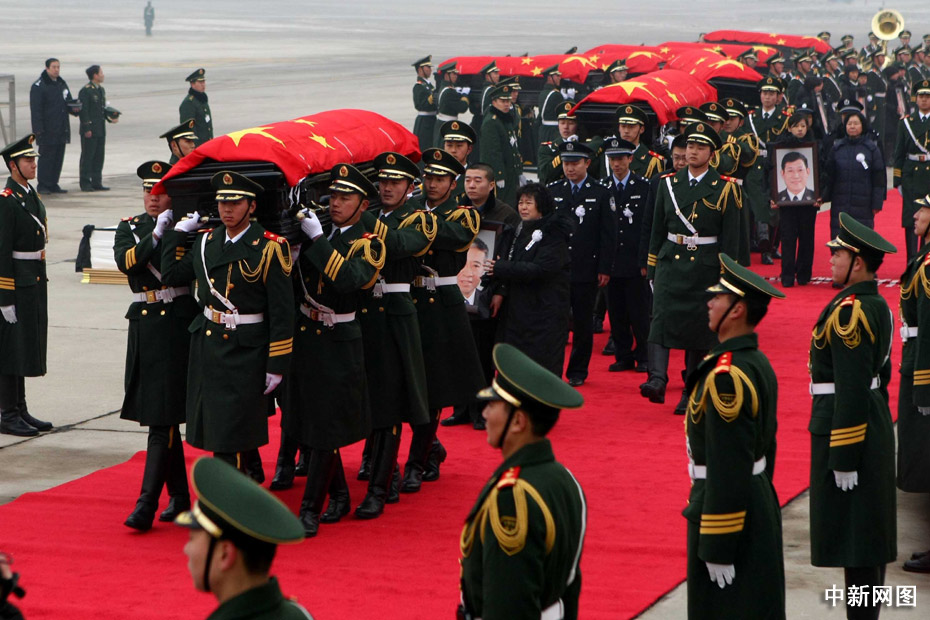 1月19日上午,在海地地震中犧牲的八位中國維和警察遺體回國接機儀式在北京首都機場舉行。中新社記者 富田 攝