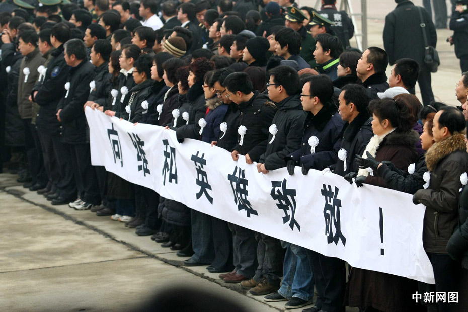 1月19日上午,在海地地震中犧牲的八位中國(guó)維和警察遺體回國(guó)接機(jī)儀式在北京首都機(jī)場(chǎng)舉行。中新社記者 富田 攝