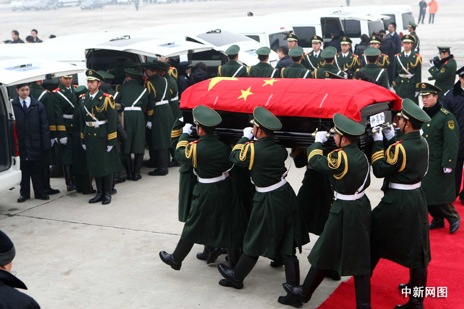 1月19日上午,在海地地震中犧牲的八位中國維和警察遺體回國接機(jī)儀式在北京首都機(jī)場舉行。中新社記者 富田 攝