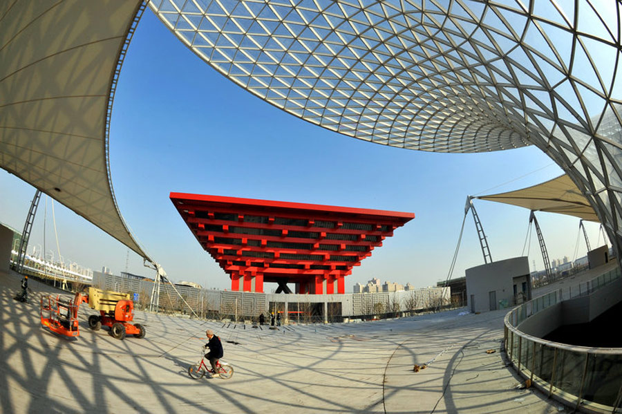 2010年1月21日上海迎來(lái)世博會(huì)開幕倒計(jì)時(shí)100天。世博會(huì)場(chǎng)館建設(shè)進(jìn)入最后沖刺階段,部分場(chǎng)館已形象初顯。圖為建設(shè)中的上海世博會(huì)世博園區(qū)-中國(guó)館、陽(yáng)光谷、世博軸。至誠(chéng)/CFP