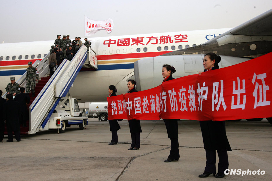 1月24日18時,由中國人民解放軍醫(yī)護(hù)人員和管理人員組成的中國醫(yī)療防疫救護(hù)隊一行40人乘坐軍運(yùn)包機(jī)離開北京,啟程前往海地進(jìn)行人道主義救援任務(wù)。