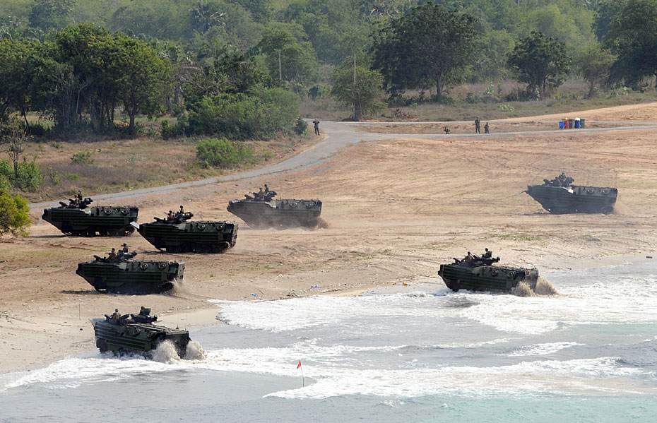 2月4日,參加“金色眼鏡蛇”聯(lián)合軍演的各國軍隊(duì),在泰國的Rayong省沙灘進(jìn)行了兩棲登陸演練。本次聯(lián)合軍演共有來自泰國、美國、印度尼西亞、新加坡、日本、韓國的約1.4萬名軍人參加。圖片來源:中國新聞網(wǎng)