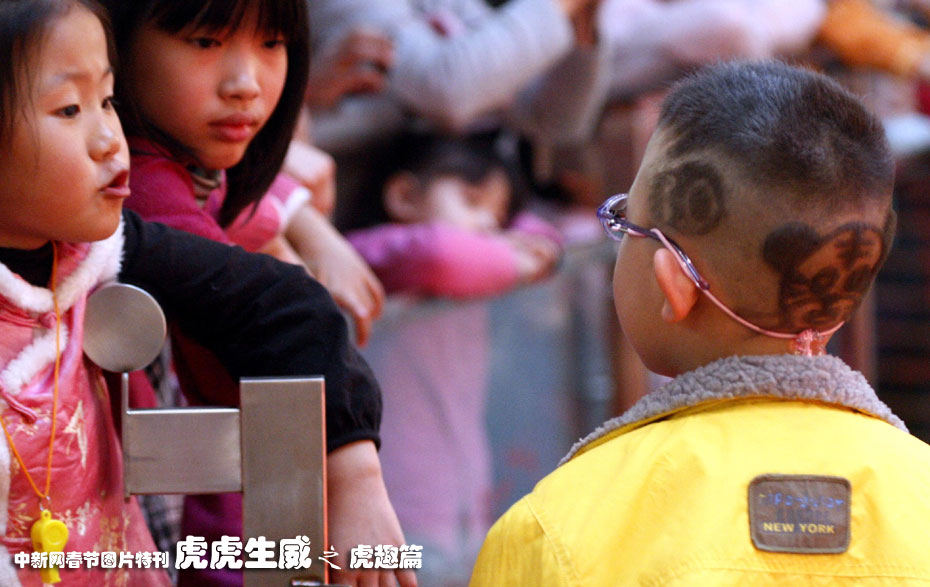 中國(guó)傳統(tǒng)新年虎年將至,北京隨處可見(jiàn)以虎為主題的各種雕塑、繪畫(huà)以及裝飾、禮品。圖為近日北京一名小朋友以最新潮的“小老虎頭”亮相顯得別具新意。中新社發(fā) 錢(qián)興強(qiáng) 攝