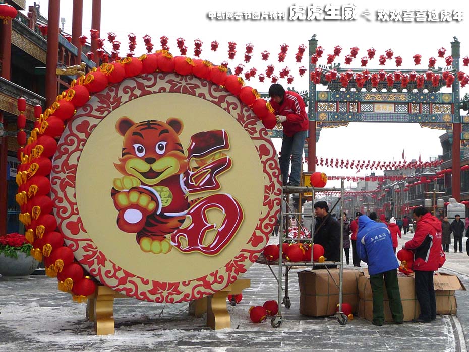 2月7日,兩個(gè)直徑3米左右的巨型“虎鼓”景觀亮相北京前門大街,與萬盞大紅燈籠交相輝映構(gòu)成一道充滿喜慶氛圍的靚麗風(fēng)景,盛裝迎接虎年新春的到來。中新社發(fā) 玉龍 攝