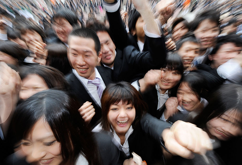 2月10日,日本東京職業(yè)學(xué)校的學(xué)生在求職動(dòng)員會(huì)上伸出拳頭展現(xiàn)信心。日本的失業(yè)率達(dá)5%,2011屆畢業(yè)生將面臨嚴(yán)峻就業(yè)形式。圖片來(lái)源:中國(guó)新聞網(wǎng)
