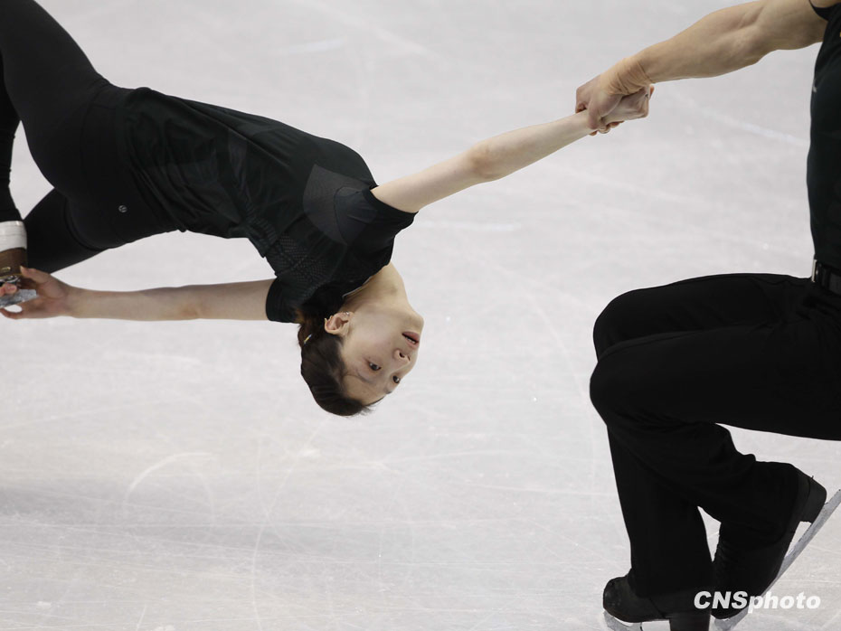 當?shù)貢r間2月13日,中國花樣滑冰隊龐清/佟健、張丹/張昊在溫哥華太平洋體育館,利用最后的休息時間重復(fù)練習(xí)積極備戰(zhàn)即將到來的比賽。中新社記者 盛佳鵬 攝