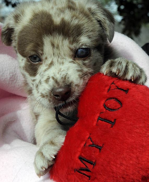 圖為美國(guó)一名澳大利亞牧羊犬小狗在玩情人節(jié)物品。圖片來(lái)源:中國(guó)新聞網(wǎng)
