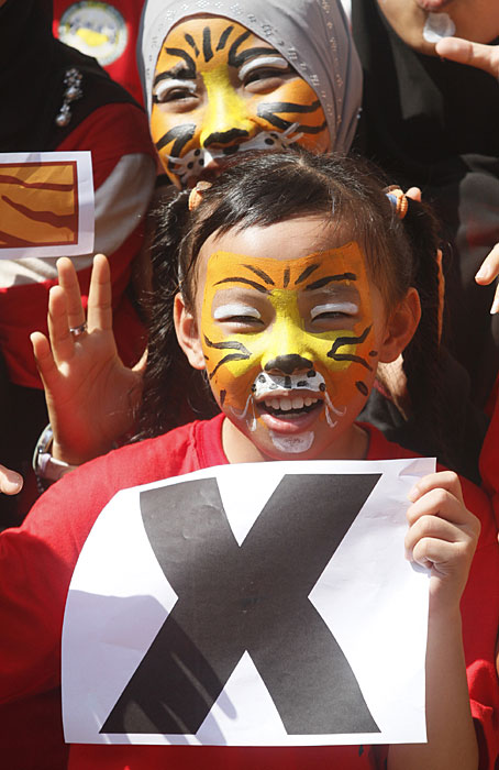 2月20日,馬來西亞民眾圍聚在首都吉隆坡附近的佛光山東禪寺,紛紛將自己繪成老虎的樣子,呼吁大家保護(hù)野生虎。圖片來源:中國新聞網(wǎng)