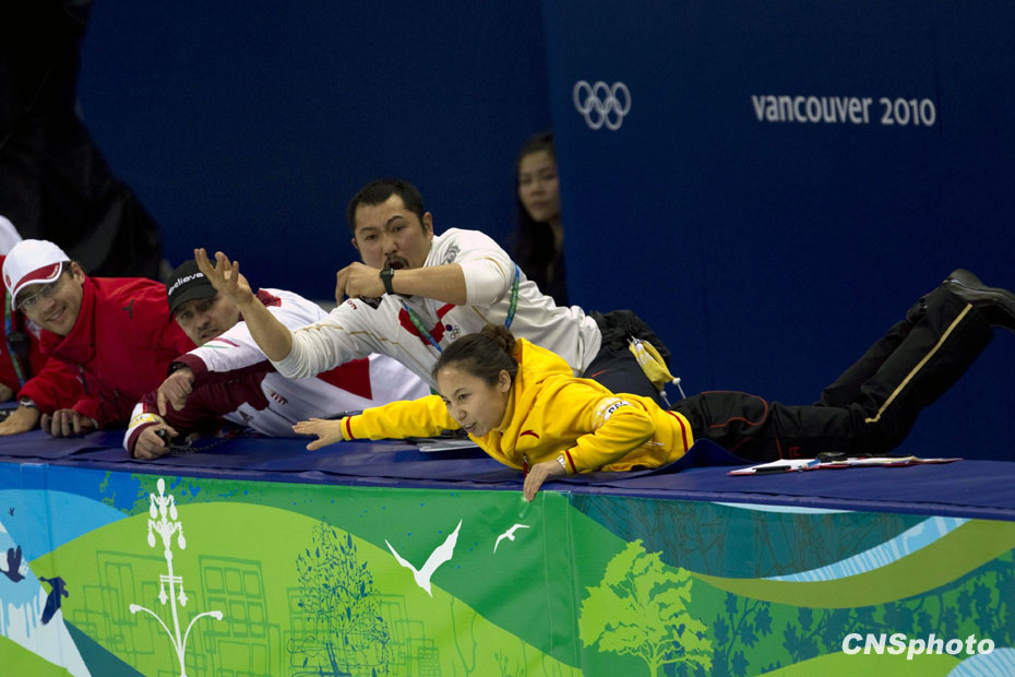 圖為中國(guó)隊(duì)主教練李琰(右一)在場(chǎng)邊為周洋加油。