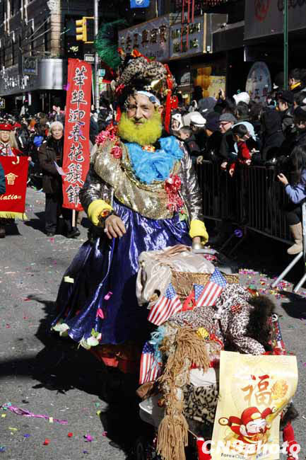 虎年紐約華埠慶祝農(nóng)歷新年“重頭戲”花車大游行21日登場,吸引超過10萬人圍觀共同狂歡,成為歷年來參加人數(shù)最多的一次花車游行。12輛盛裝花車以及數(shù)千人的表演團(tuán)隊(duì)沿著華埠最熱鬧的數(shù)十條街道一邊行進(jìn)一邊表演,滿天彩帶飄揚(yáng),場面熱鬧非常。圖為游行隊(duì)伍中奇裝異服的美國人。