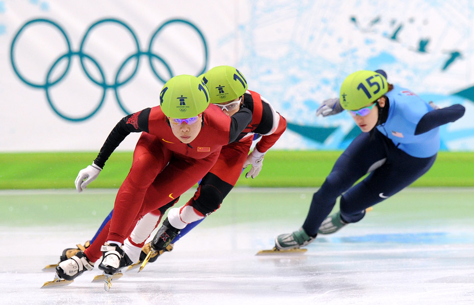 當?shù)貢r間2月24日,溫哥華冬奧會女子短道速滑3000米接力A組決賽中,中國隊王濛、周洋、孫琳琳、張會四朵金花聯(lián)袂出擊,最終將金牌歸入中國隊囊中。圖片來源:中國新聞網(wǎng)