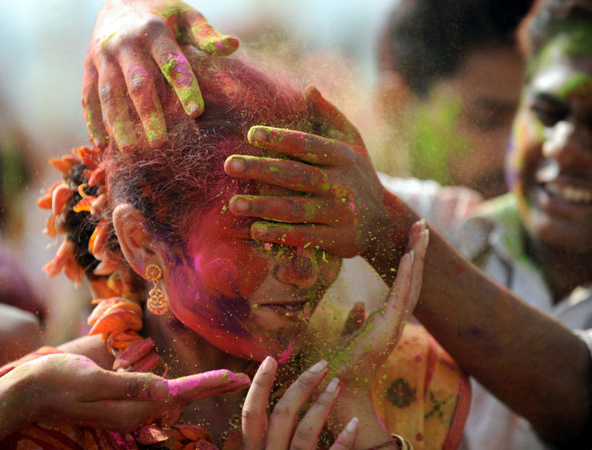 2月28日,印度舉行慶祝灑紅節(jié)活動,人們互撒顏料以示祝福。圖片來源:中國新聞網(wǎng)
