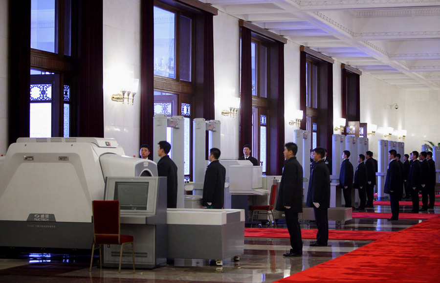3日下午,全國(guó)政協(xié)十一屆三次會(huì)議將在北京人民大會(huì)堂開幕,2010年全國(guó)“兩會(huì)”由此正式揭開大幕,目前各項(xiàng)工作準(zhǔn)備就緒。圖為人民大會(huì)堂的主要入口處的安保人員。Feng Li 攝