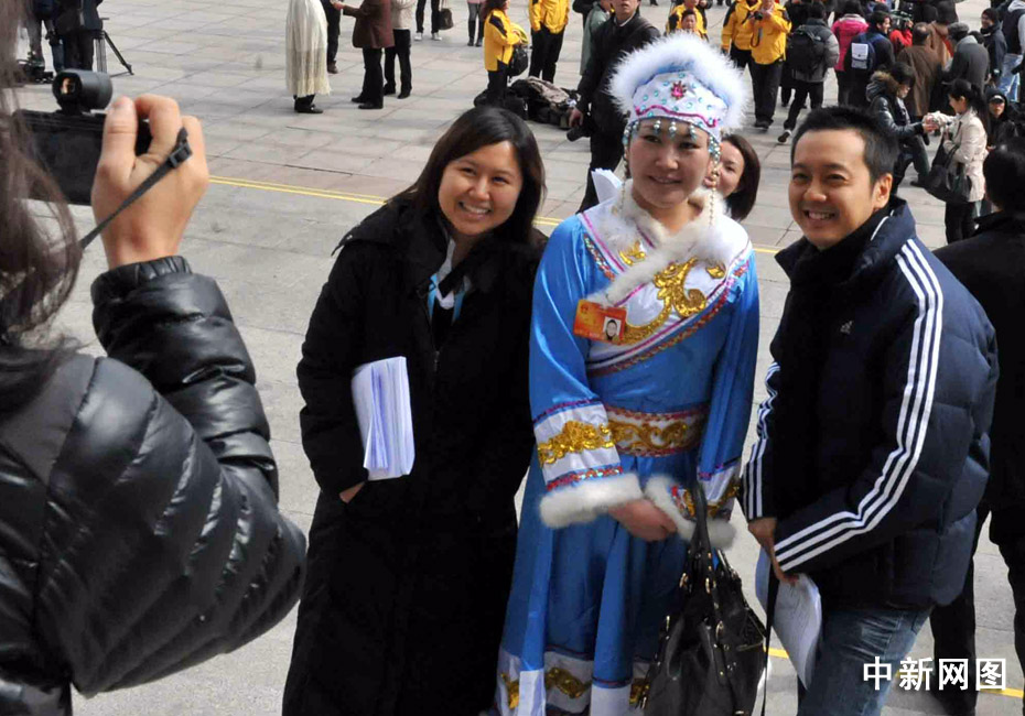 十一屆全國(guó)人大三次會(huì)議3月5日在北京開(kāi)幕,各民族人大女代表的服飾靚麗多彩,在天安門(mén)廣場(chǎng)前大展英姿。 中新社記者 賈國(guó)榮 攝