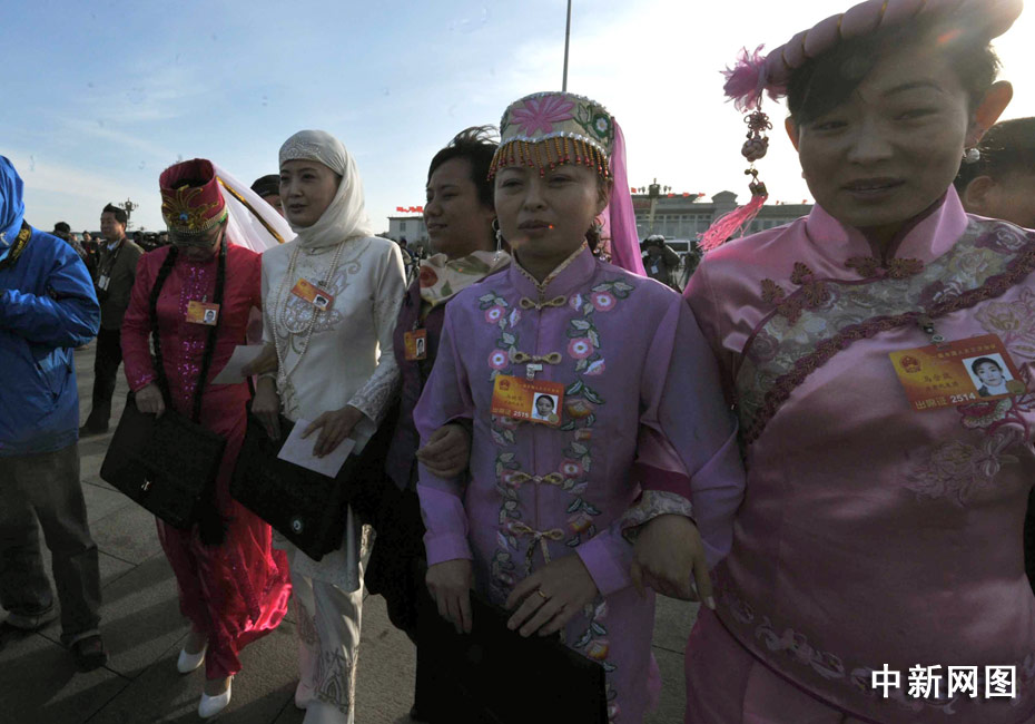 十一屆全國(guó)人大三次會(huì)議3月5日在北京開(kāi)幕,各民族人大女代表的服飾靚麗多彩,在天安門廣場(chǎng)前大展英姿。 中新社記者 賈國(guó)榮 攝