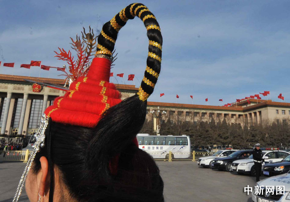 十一屆全國人大三次會議3月5日在北京開幕,各民族人大女代表的服飾靚麗多彩,在天安門廣場前大展英姿。 中新社記者 賈國榮 攝
