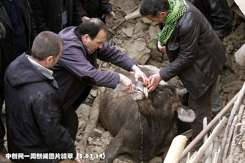 周二在土耳其奧克丘拉爾,人們?cè)噲D解救一頭被困在廢墟中的牛。土耳其此前一天發(fā)生的強(qiáng)烈地震造成至少50人遇難。圖片來源:中國新聞網(wǎng)