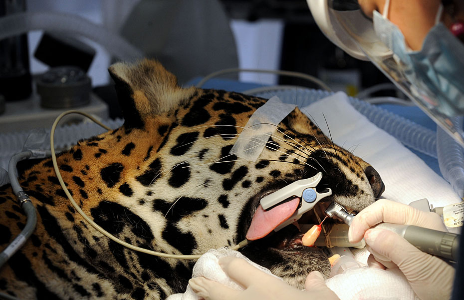 3月13日,在哥倫比亞麥德林附近的一個獸醫(yī)診所,一只雌性美洲虎在接受牙齒手術。圖片來源:中國新聞網(wǎng)