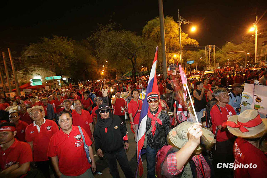 3月13日起,泰國“紅衫軍”陸續(xù)從泰國北部、東北部等外府進入曼谷市,在集會主會場搭設演講舞臺和帳篷,拉開大規(guī)模示威序幕。圖片來源:中國新聞網