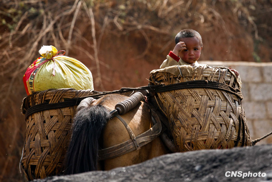 據(jù)云南省氣象部門評(píng)定,全省綜合氣象干旱重現(xiàn)期為80年以上一遇,其中滇中、滇東、滇西東部的大部地區(qū)為百年以上一遇。圖為隨家人外出運(yùn)水的兒童。中新社發(fā) 劉冉陽 攝