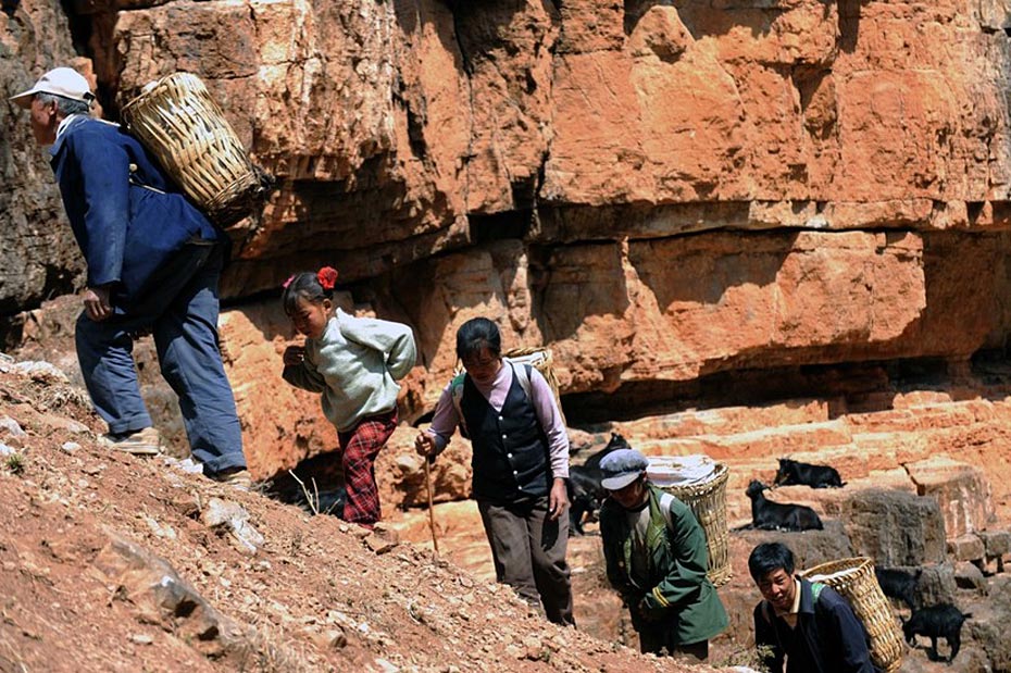 村民背著水走在陡峭的山崖上(3月7日攝)。村民需要背著幾十公斤重的水桶,從海拔1000多米的江邊,小心翼翼地往海拔1800多米的村中跋涉。圖片來源:新華網(wǎng) 秦晴 攝