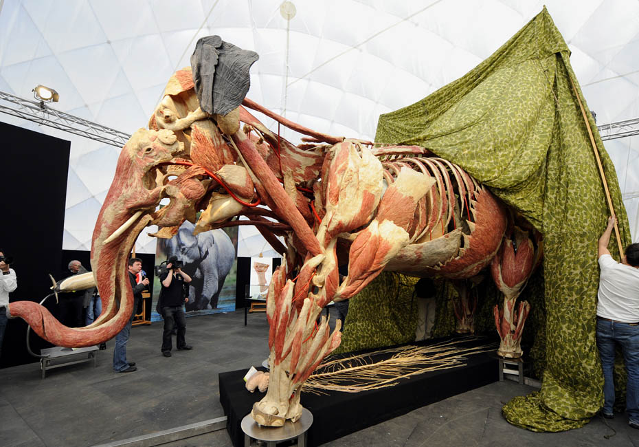 德國著名解剖學(xué)家鞏特爾·馮·哈根斯博士被稱為“死亡先生”,目前展出的是有史以來的最大的動物尸體。體型巨大的“桑芭”尸體高3.5米,重3.2噸。據(jù)悉“桑芭”將于2010年4月歸還諾因基興動物園。圖片來源:中國新聞網(wǎng)