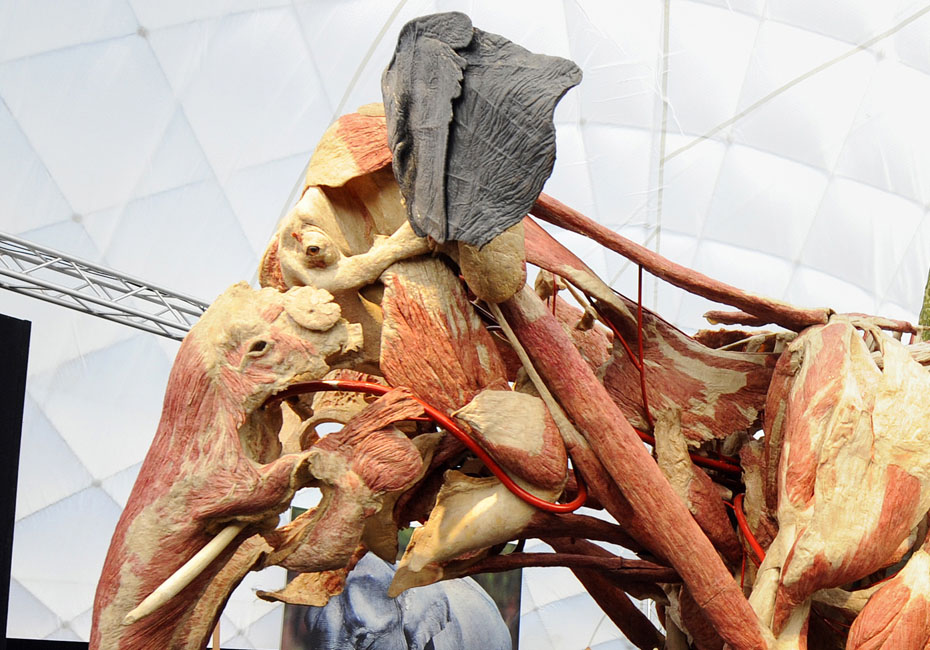 德國(guó)著名解剖學(xué)家鞏特爾·馮·哈根斯博士被稱為“死亡先生”,目前展出的是有史以來(lái)的最大的動(dòng)物尸體。體型巨大的“桑芭”尸體高3.5米,重3.2噸。據(jù)悉“桑芭”將于2010年4月歸還諾因基興動(dòng)物園。圖片來(lái)源:中國(guó)新聞網(wǎng)