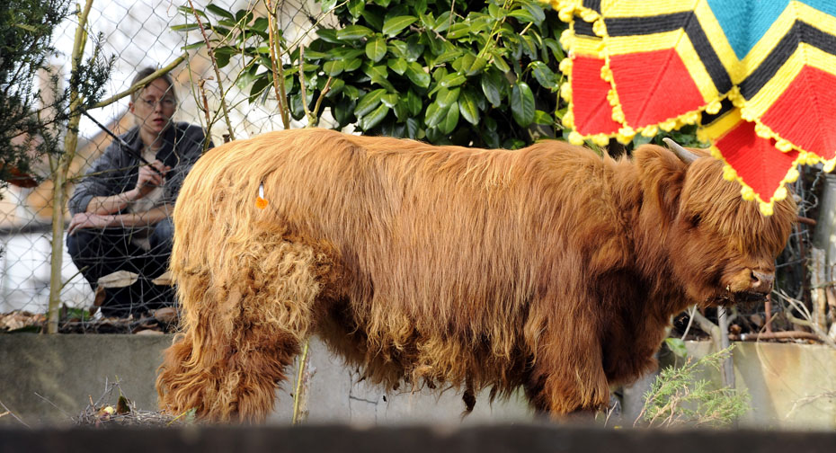 3月18日,德國一頭蘇格蘭高地牛來到一居民院內(nèi)懶洋洋的曬太陽,最后經(jīng)過獸醫(yī)的麻醉和消防員協(xié)力才將這頭蠻力十足的家伙“制服”。圖片來源:中國新聞網(wǎng)