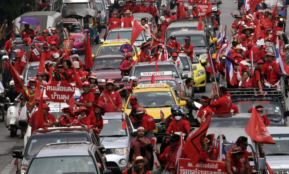 泰國紅衫軍20日號(hào)召數(shù)千輛汽車上街,在曼谷大游行,路線總長約45公里,橫跨曼谷多條主要街道,勢要癱瘓曼谷。軍方估計(jì),將有3萬紅衫軍抵達(dá)曼谷聲援。