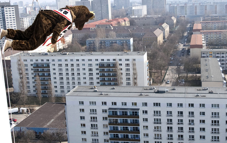3月18日,在德國(guó)柏林舉行的“高樓漫步”活動(dòng)中,一名女子打扮成熊的模樣(柏林的象征)在天使酒店外墻上行走,參加活動(dòng)的人都有繩索保護(hù)。圖片來源:中國(guó)新聞網(wǎng)