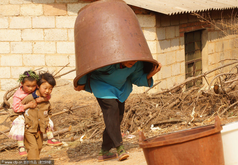 2010年3月26日,云南省尋甸縣河口鄉(xiāng),一個(gè)在云南省最早出現(xiàn)旱情的地方,現(xiàn)在很多村的水只能靠政府以及愛心企業(yè)免費(fèi)送水維持生活,很多農(nóng)田絕收,并且正在影響春耕。馬健/CFP